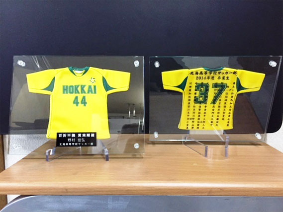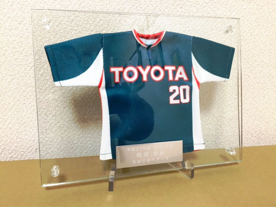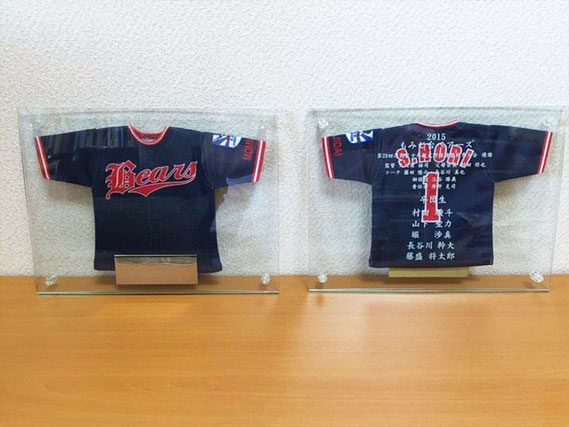 こちらもかなり人気のアイテムです。一緒に闘った思い出のユニフォームを形に残しませんか。アクリルフレームに入れたり、額縁に入れたりと応用できます。フレームには、一緒に戦ったチームのみんなの名前を入れることもできます。